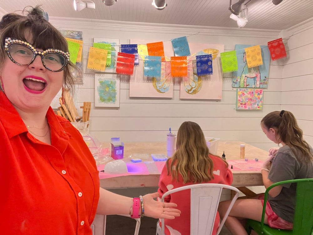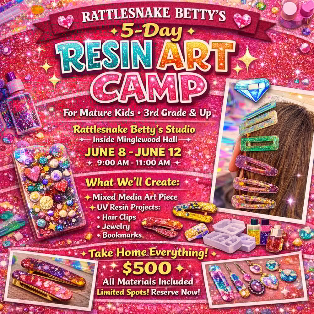 Rattlesnake Betty’s Resin Art Camp is a five-day, hands-on creative experience designed for mature students entering 3rd grade and up who love color, sparkle, and making things with intention.